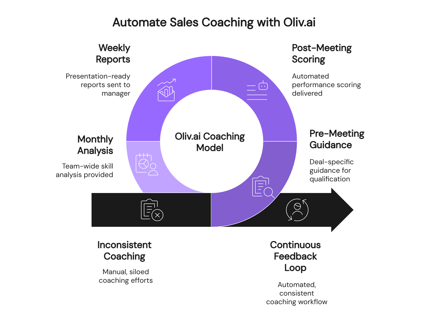 Circular workflow visualization of Oliv.ai's automated coaching model featuring four touchpoints: pre-meeting guidance, post-meeting scoring, weekly reports, and monthly analysis, contrasting inconsistent manual coaching with continuous automated feedback loops.