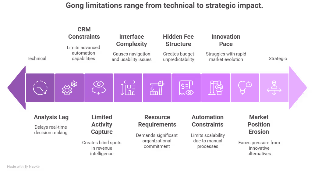 Gong Analytics faces three critical limitations: processing delays (5-10 minutes minimum for conversation analysis vs. real-time alternatives), manual workflows requiring human intervention for scorecard building and follow-up actions, and integration restrictions (limited to 25 custom CRM fields and 8 webhook event types). Users frequently report interface complexity requiring navigation through multiple screens, excessive notifications without prioritization, and hours-long wait times before actionable insights become available. Additionally, Gong's conversation-centric approach creates blind spots—focusing primarily on recorded calls with limited email intelligence and no web-based research integration. The platform's technical architecture prevents live coaching capabilities and requires manual interpretation to convert insights into actions. Organizations experiencing these constraints increasingly explore platforms offering automated AI agents that eliminate manual workflows entirely.