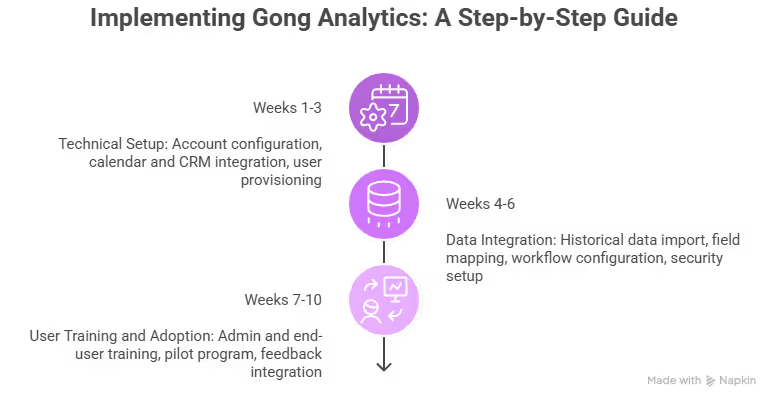 Gong Analytics implementation typically requires 8-10 weeks for full deployment across three phases: technical setup (weeks 1-3), data integration (weeks 4-6), and user training and adoption (weeks 7-10). Organizations need dedicated RevOps resources (0.5-1.0 FTE), technical expertise for CRM integration, and 8-12 hours of training per user. Implementation costs range from $15,000-$30,000 beyond platform fees. Common challenges include integration complexity with multiple systems, CRM field mapping difficulties, and user resistance to conversation recording. We've observed that modern revenue intelligence platforms now offer streamlined implementations in 2 weeks with automated configuration and pre-built integrations—explore our interactive sandbox to experience rapid deployment capabilities that reduce time-to-value by 75%.
