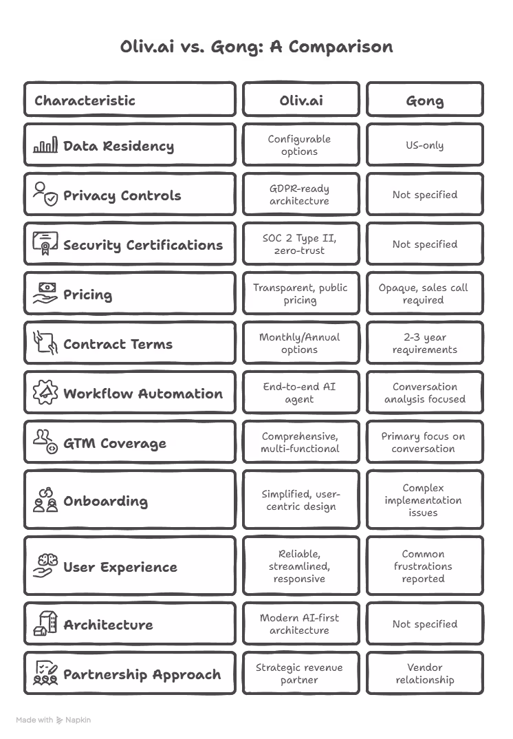 As revenue intelligence requirements evolve, Oliv.ai emerges as a compelling enterprise-grade alternative that addresses many of Gong's fundamental limitations while providing enhanced security, transparency, and operational flexibility.