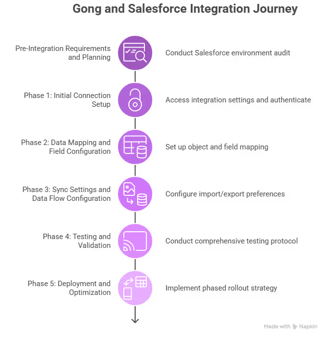 Step-by-step journey for successfully integrating Gong with Salesforce, from setup to deployment.