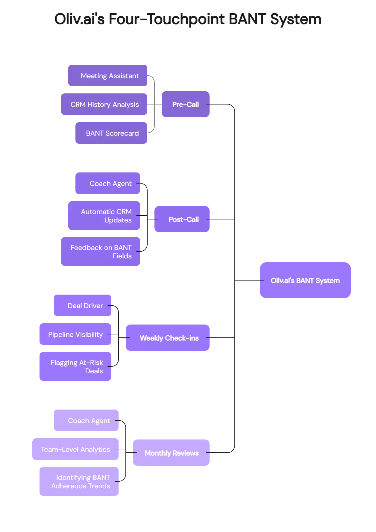 Oliv.ai operationalizes BANT through an integrated four-touchpoint approach spanning the entire deal lifecycle: