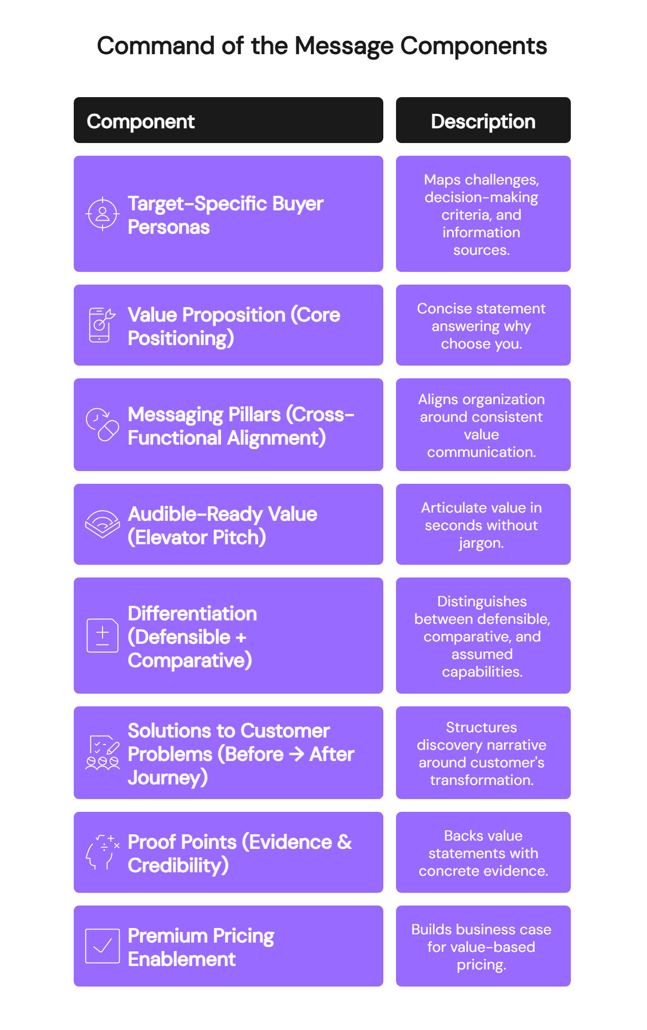 Command of the Message structures value-based selling around eight interconnected components that transform how sales teams communicate differentiation, qualify opportunities, and justify premium pricing. Each component serves a specific purpose in the discovery-to-close journey, working together to shift conversations from product features to business outcomes.