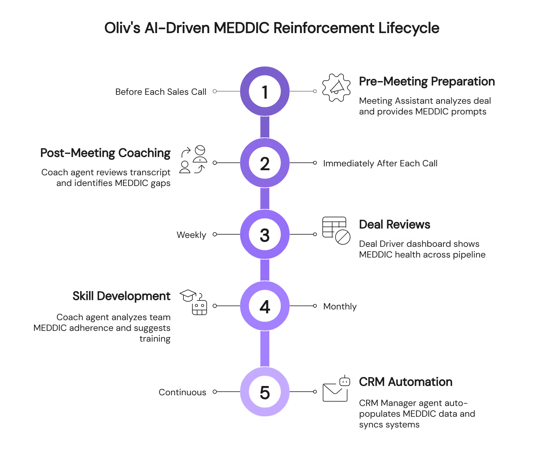 Automatic MEDDIC capture: The article emphasizes that "Oliv streamlines key sales processes, provides deal insights, and auto-populates CRM with MEDDIC/BANT scorecards". Unlike traditional tools requiring manual data entry, we automatically analyze every sales conversation using fine-tuned LLMs trained on 100+ sales methodologies including MEDDIC.